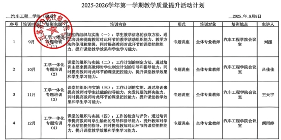 为系统深化工学一体化教学改革,落实 2025-2026 学年第一学期教学质量提升计划,汽车工程学院于 9月起开展为期一学期的 “工学一体化专题系列培训”,邀请刘摞、吕佳佳、王天宇、阚雨婷四位教师分阶段主讲,学院全体专任教师全程参与。